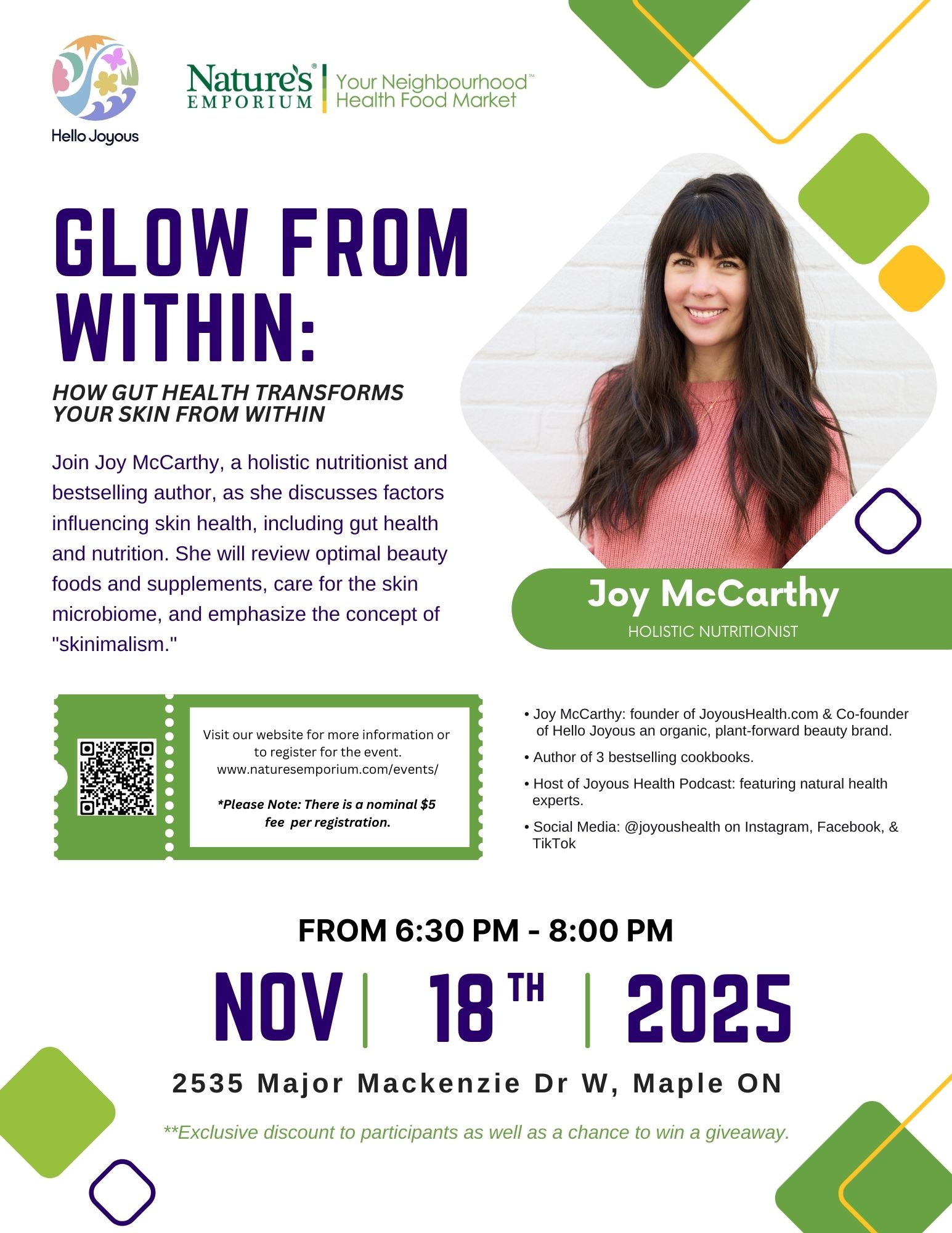 Nature's Emporium (Maple) 2535 Major Mackenzie Drive West, Vaughan, ON, CanadaJoin Joy McCarthy, a holistic nutritionist and bestselling author, as she discusses factors influencing skin health, including gut health and nutrition. She will review optimal beauty foods and supplements, care…